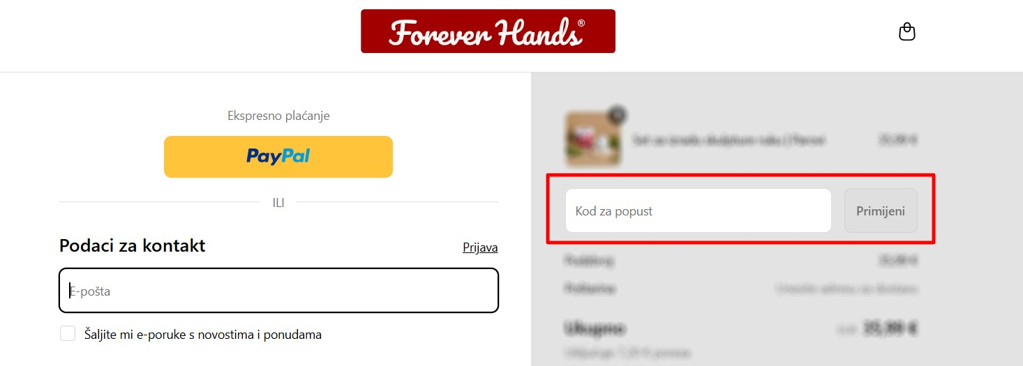 Kada ste odabrali svoje proizvode upišite odabrani kod u prostor 'Kod za popust' i pritisnite 'Primijeni'. Čestitamo - uspješno ste iskoristili ForeverHands popust.